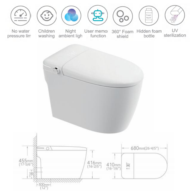 Which offers all of the functions of the Q6 smart intelligent toilet. UV light sanitzer, sensor opening lid and seat, instant variable seat warming, massage function, bidet cleaning and warm air drying.